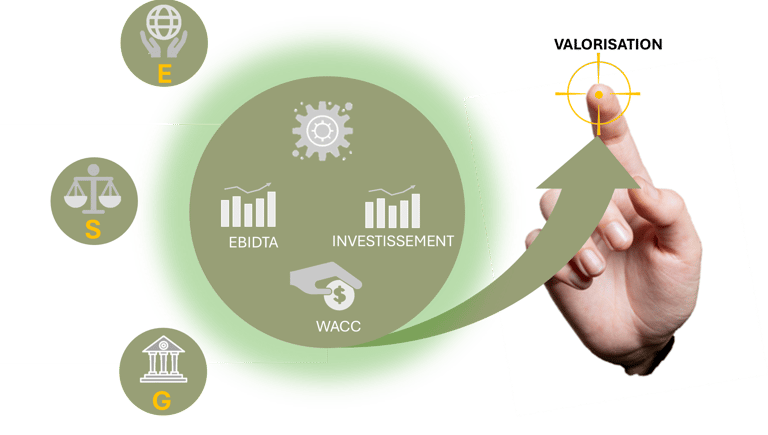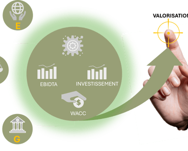des multiples d'EBITDA améliorés, une facilité d'accès au capital et une réduction significative de son coût (WACC). L’ensemble de ces paramètres ayant une incidence positive ou négative sur la valorisation d'une entreprise. Notre approche décrit un lien concret entre les actions ESG, la performance financière et la valorisation de la société.