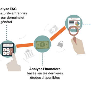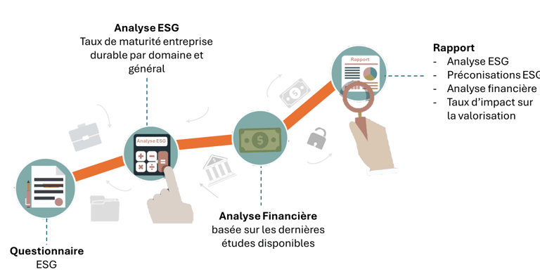 Notre méthodologie s'articule autour d'un processus structuré visant à quantifier l'impact ESG sur la valorisation financière d'une entreprise. Un questionnaire ESG nous permet de recueillir des données sur l'état des actions durables mise en œuvre par l'entreprise. Ces informations nous permettent d’effectuer une analyse sur le périmètre ESG, de formuler des préconisations adaptées et de calculer un niveau de maturité ESG.